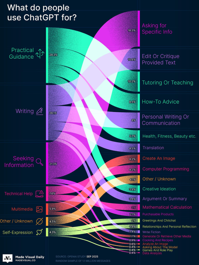 该图表表明,人们最常使用 ChatGPT 进行实用指导和写作,这两个类别的使用率最高(分别为 28.3% 和 28.1%)。在这些大类中,最常见的子任务是“询问特定信息”和“辅导或教学”。