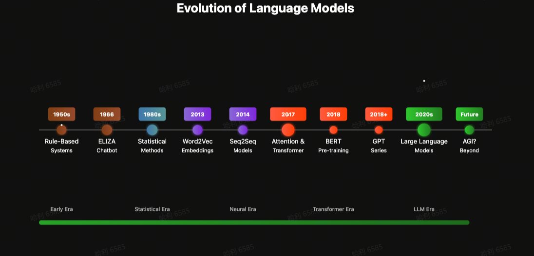 - Color-Coded Eras: Different gradients represent different eras:· Brown tones for early rule-based systems· Blue tones for statistical methods· Purple tones for neural network approaches· Red/orange for the transformer revolution· Green for the current LLM era