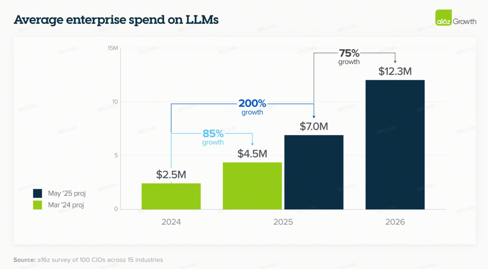 LLM 预算的增长超出了企业一年前(本已很高的)预期,并且没有迹象表明这种增长会放缓。企业领导者预计未来一年平均增长约 75%。正如一位 CIO 指出的:“我在 2023 年的花费,现在一周就花完了。”
