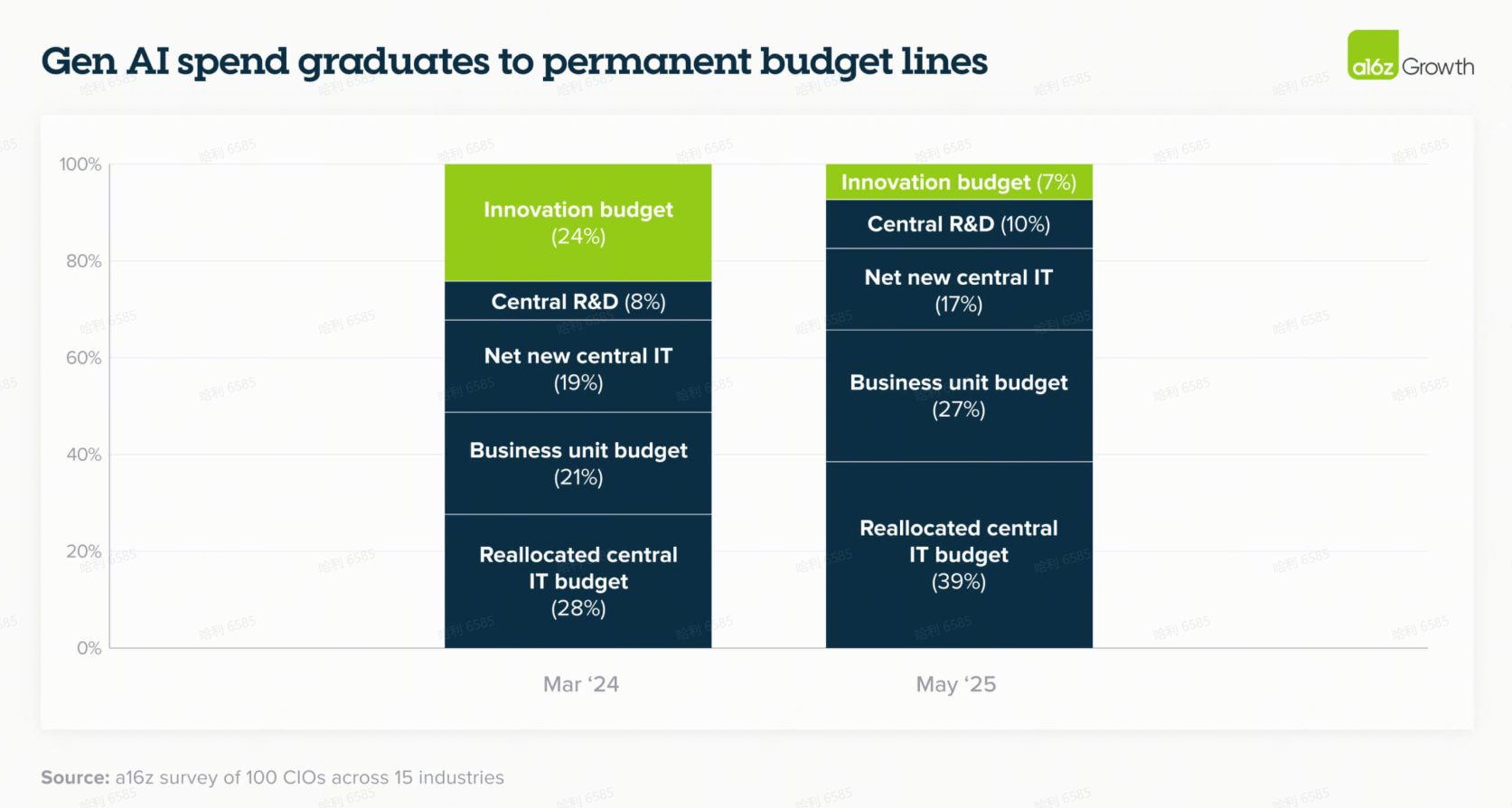 去年,创新预算仍占 LLM 支出的四分之一,现在这一比例已降至仅 7%。企业越来越多地通过集中化的 IT 和业务部门预算来支付 AI 模型和应用程序的费用。这反映出一种日益增长的情绪,即生成式 AI 不再是实验性的,而是对业务运营至关重要。一位 CTO 指出:“我们更多的产品正在增加 AI 功能,因此我们的支出增长将在所有这些产品中上升”——这表明向核心预算的转变只会加速。