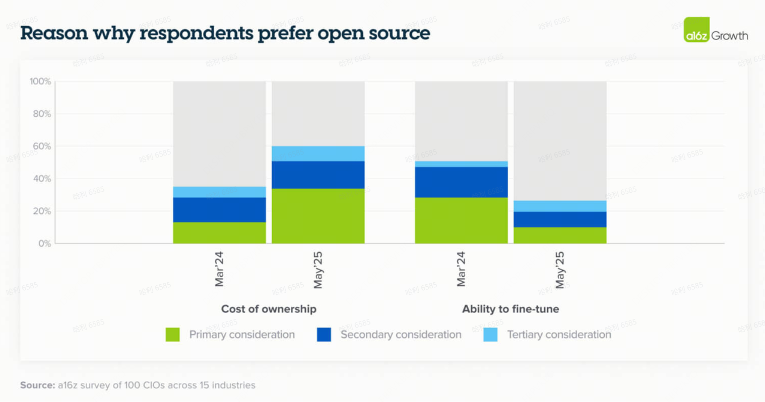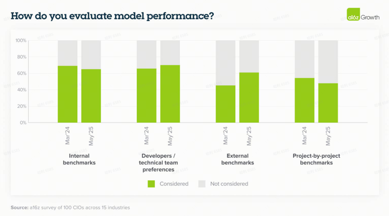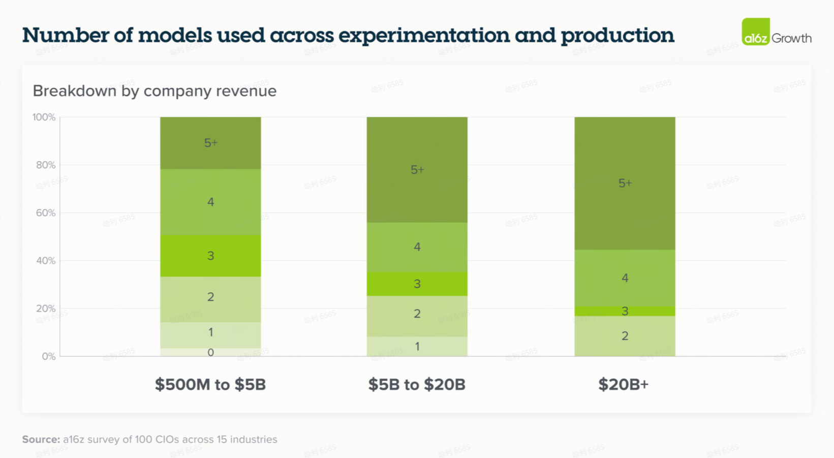正如我们在“模型”部分提到的,企业也在将特定用例与合适的模型匹配方面变得更加成熟。对于高度可见或性能关键的应用,公司通常更喜欢具有强大品牌认知度的前沿模型。相反,对于更简单或内部的任务,模型选择通常纯粹取决于成本。