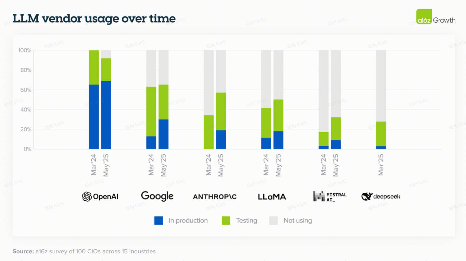 - 企业在混合搭配多种模型以在性能和成本之间进行优化方面变得更加成熟。OpenAI、Google 和 Anthropic 占据了总体的主导市场份额,而 Meta 和 Mistral 在开源选项中很受欢迎。