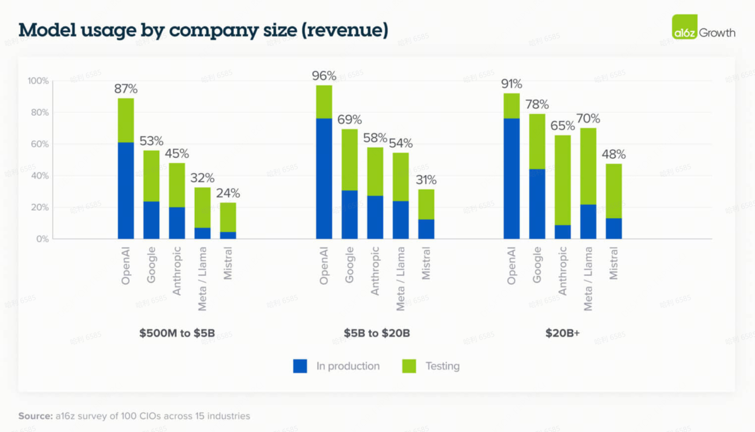 - 像 Llama 和 Mistral 这样的开源模型的采用率在大型企业中往往高于在较小公司中的采用率。这通常是由对本地部署解决方案的偏好所驱动的,考虑到数据安全性和合规性,以及为特定企业用例进行微调(fine-tune)的能力。