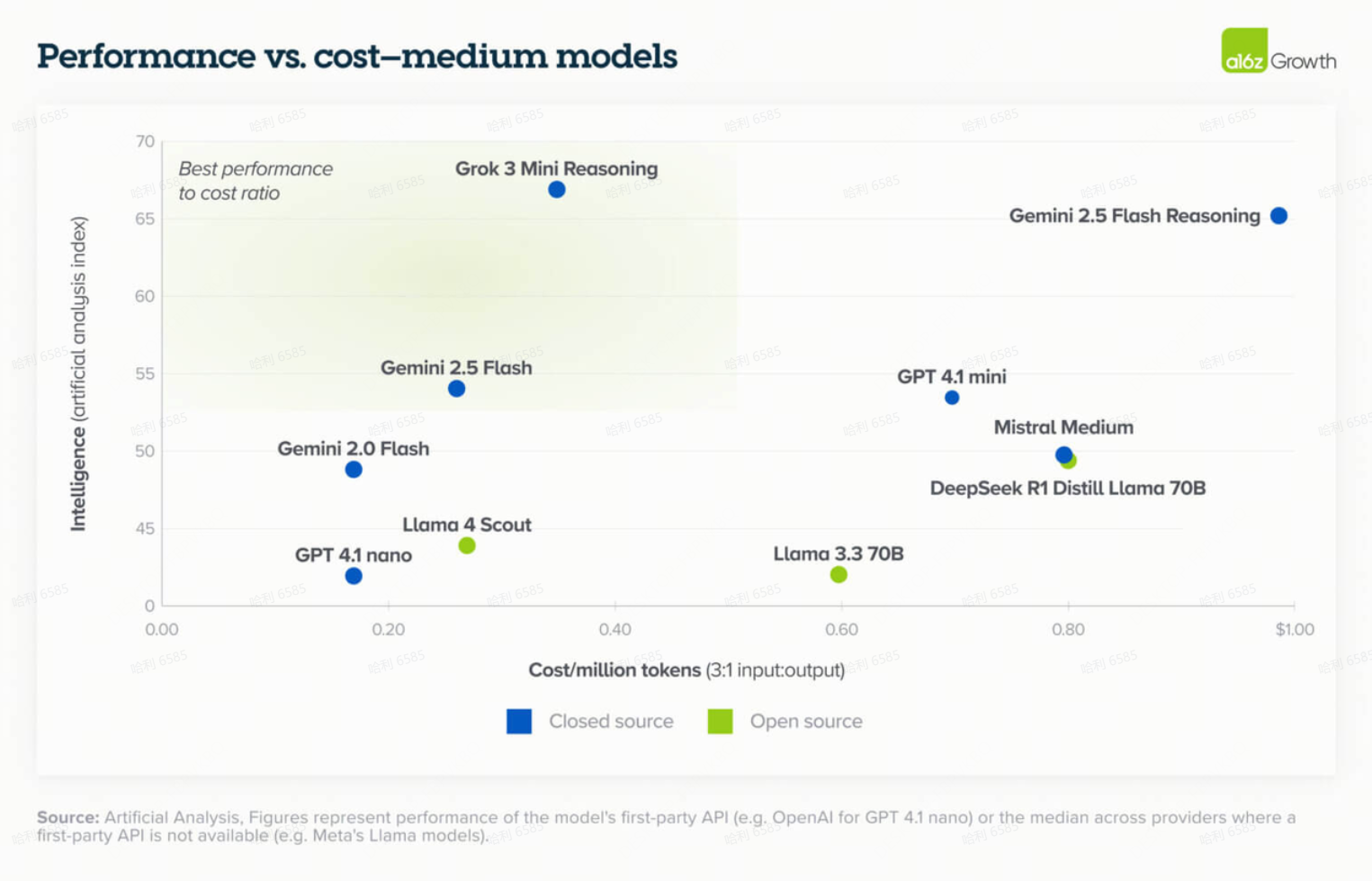 模型成本每 12 个月下降一个数量级。在此背景下,我们也看到闭源模型的性能价格比对于中小型模型已变得更具吸引力,xAI 的 Grok 3 mini 和 Google 的 Gemini 2.5 Flash 在这方面领先。在某些情况下,鉴于这种转变以及其他生态系统优势,客户更频繁地选择闭源模型。正如一位客户所说:“定价变得有吸引力了,而且我们已经嵌入了 Google 生态系统:我们从 G Suite 到数据库都在使用,他们的企业专业知识很有吸引力。”或者另一位更简洁地表示:“Gemini 很便宜。”