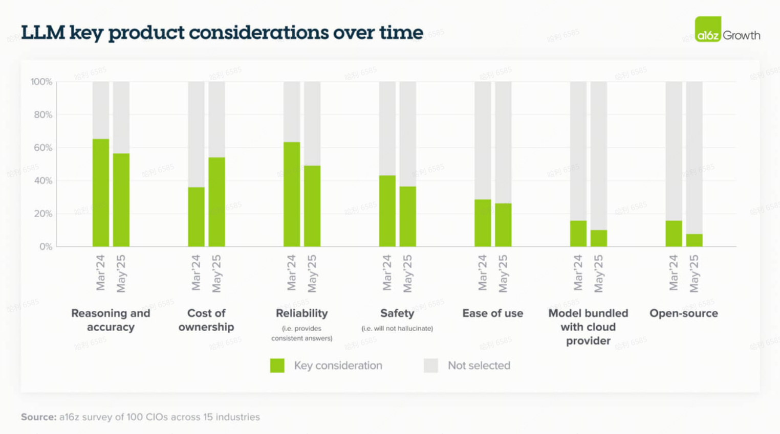公司现在以规范的评估框架来处理模型选择,并且诸如安全性(在我们的访谈中被高度重视)和成本等因素在整体准确性和可靠性方面获得了更多重视。这种转变强调了企业对模型性能的信任度增加,以及 LLM 将被大规模部署的信心。正如一位领导者简明地总结道:“对于大多数任务,所有模型现在都表现得足够好——所以定价已成为一个更重要的因素。”