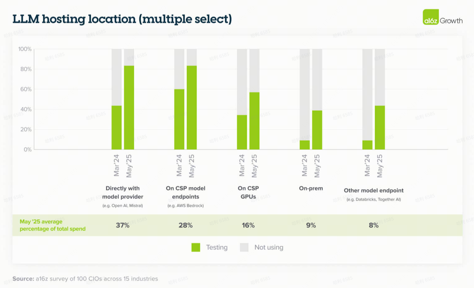 这通常是因为领导者“希望直接访问具有最佳性能的最新模型,早期访问预览也很重要。”与模型提供商(包括 OpenAI 和 Anthropic)直接合作的信任度增加,与我们去年与企业访谈时听到的情况相比是一个重大转变:当时许多企业尽可能通过云提供商访问模型,有时甚至不是通过其主要云提供商。
