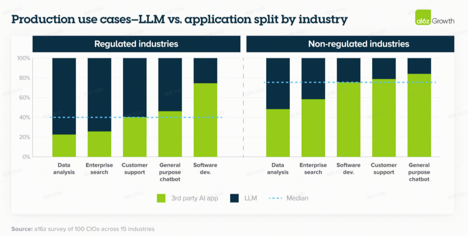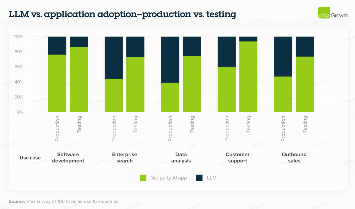 此外,在像 AI 这样动态的领域,公司发现内部开发的工具难以维护,并且通常不会给它们带来业务优势——这进一步巩固了它们购买而非构建应用程序的兴趣。