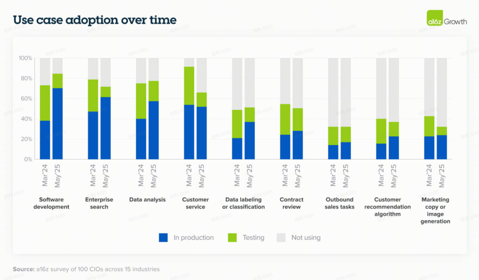 虽然我们看到 AI 用例在各个领域逐步被采用——特别是内部企业搜索、数据分析和客户支持——但软件开发的采用出现了阶跃变化(step change),这是由一系列因素共同驱动的完美风暴:极其高质量的现成应用程序、模型能力的显著提高、对广泛公司和行业的普适性,以及一个毋庸置疑的 ROI 用例。