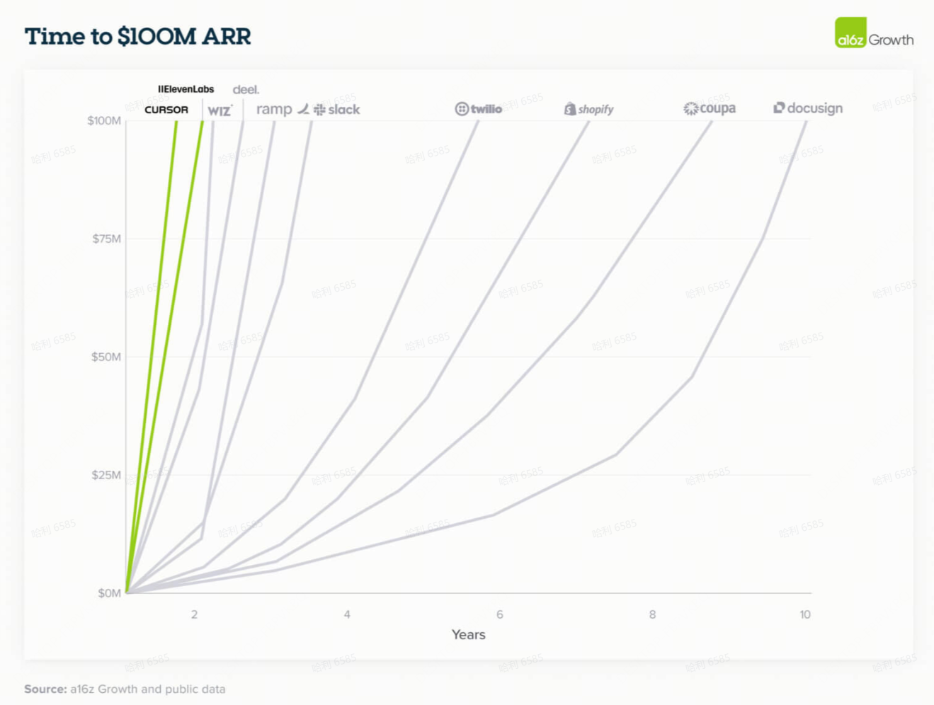 就像一些早期的平台转变(例如互联网)一样,领先的企业 AI 应用的早期增长很大一部分是由专业消费者市场(介于专业和消费者之间)推动的。这由 ChatGPT 启动,并得到编码应用程序和像 ElevenLabs 这样的创作者工具的强调。许多 CIO 指出,他们购买企业版 ChatGPT 的决定是受“员工喜爱 ChatGPT。这是他们知道的品牌名称”所驱动。这种双重市场拉动导致新一代 AI 公司的增长速度比我们过去看到的要快得多。