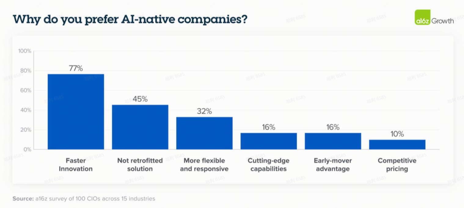 毫不奇怪,买家偏好 AI 原生供应商的主要原因是它们更快的创新速度。第二个原因是认识到,相比于现有企业将 AI 改造到现有解决方案中,围绕 AI 从头构建的公司能提供根本上更好的产品和卓越的结果。