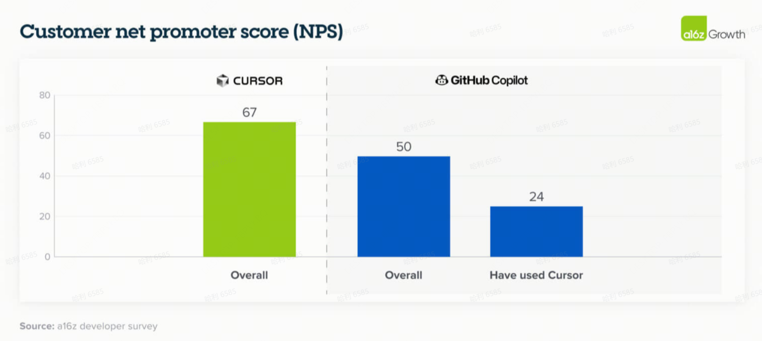 这种差距今天在软件开发中尤其明显,一家上市安全公司的 CIO 强调了第一代和第二代 AI 编码工具在编码变得更加智能体化(agentic)时的能力差异。用户满意度数据也呼应了这种转变:采用 Cursor(一种生成式AI原生编码解决方案)的用户对上一代工具(如 GitHub Copilot )的满意度明显较低,这强调了创新如何迅速从根本上重塑买家对 AI 可以且应该期望的结果。
