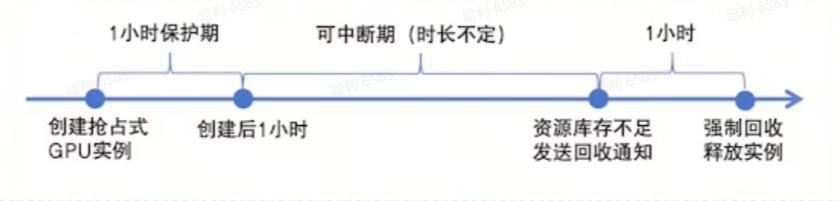 - 平台定时检测资源库存。当资源库存不足时,对于超出保护期的 Spot 实例,发送1小时后中断回收的通知。